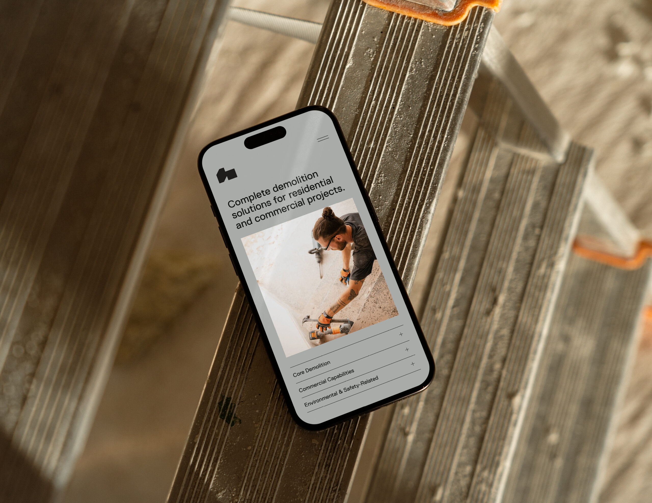 The logo combines a strong wordmark with a geometric icon designed to convey structure, transformation, and momentum. Its angular construction references architectural forms and demolition processes while maintaining a clean, recognisable silhouette. The result is a mark that feels bold and industrial, yet refined enough to communicate professionalism and trust.